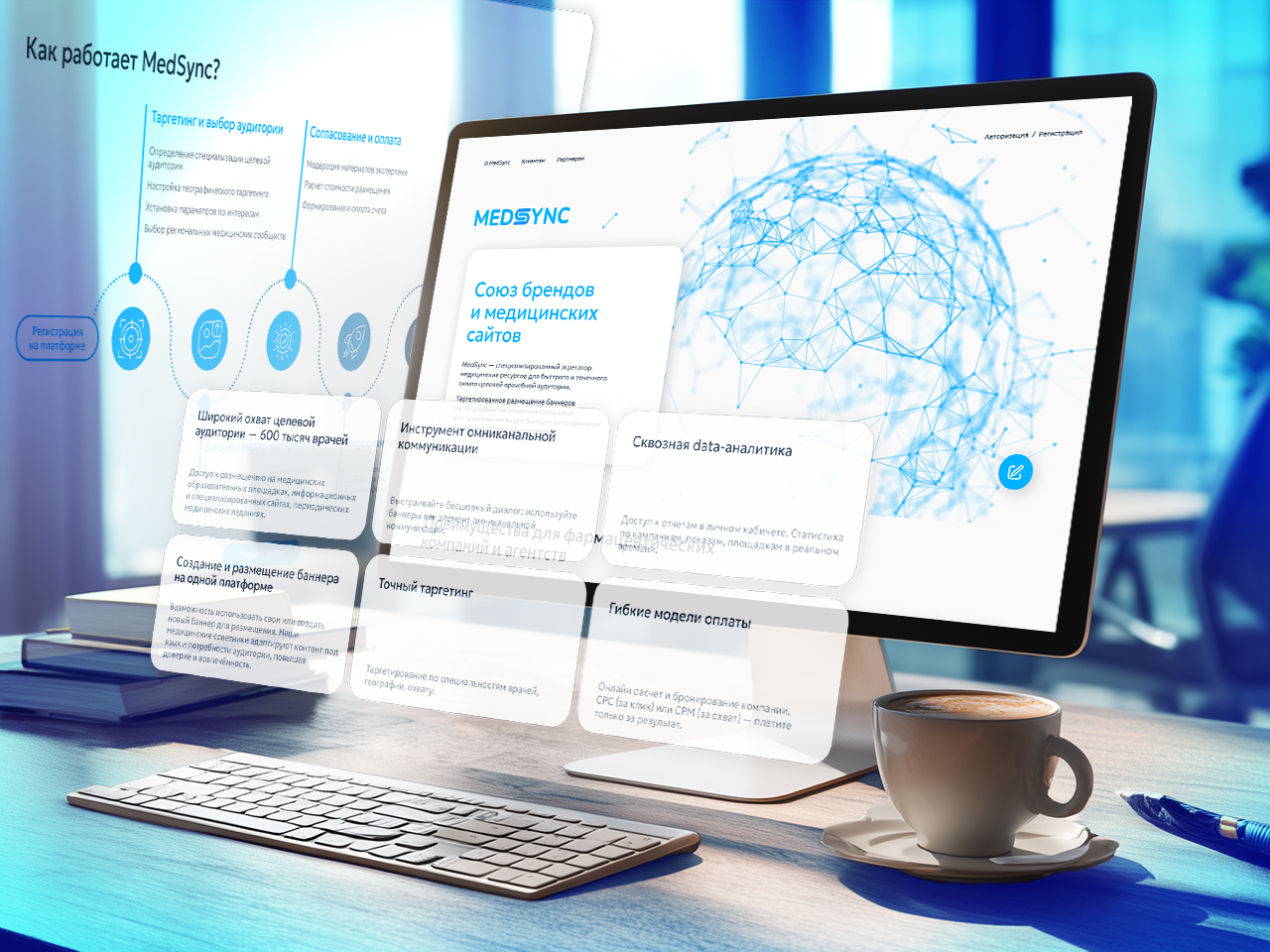 MedSync — электронная площадка размещения рекламного контента на сайтах, порталах медицинских сообществ, охватывающих более 80% врачей различных специализаций во всех регионах России. Продукт будет доступен уже в марте 2026!